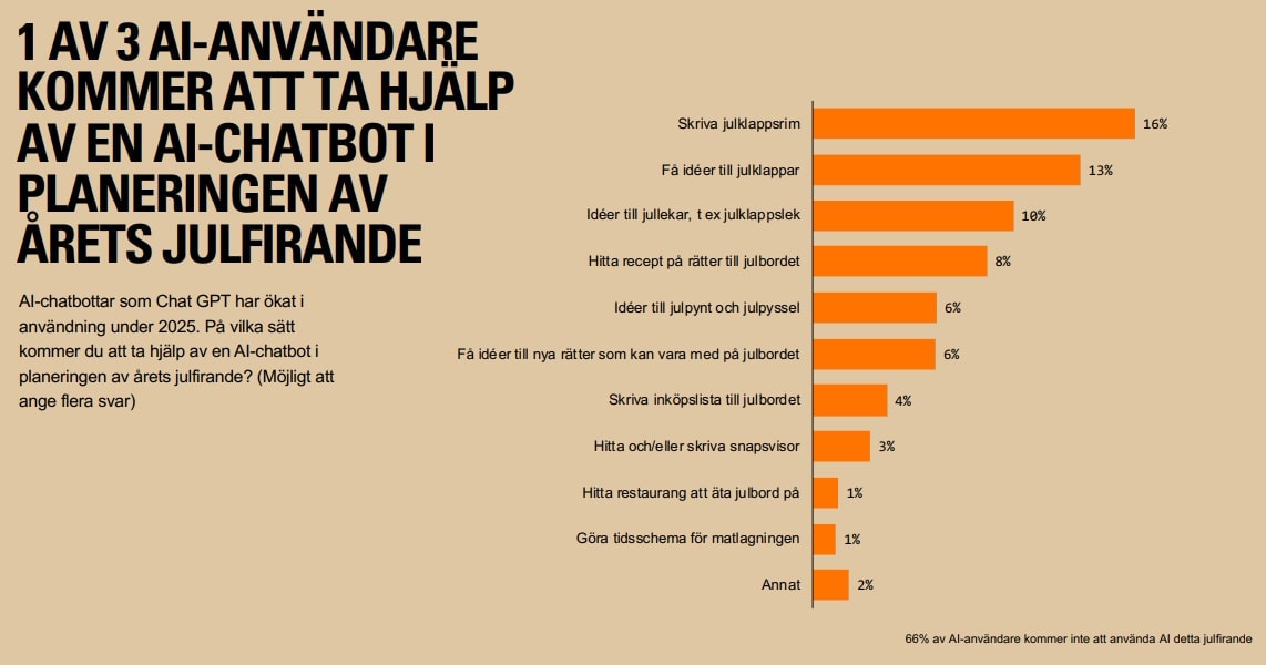 2025 var året då AI-chatbotar som Chat GPT, Gemini och Copilot fick sitt stora folkliga genomslag. Kommer detta även påverka hur svenskarna planerar sitt julfirande? Det verkar så. Enligt Livsmedelsföretagens julmatsundersökning kommer 1 av 3 AI-användare att ta hjälp av en AI-chatbot i år.