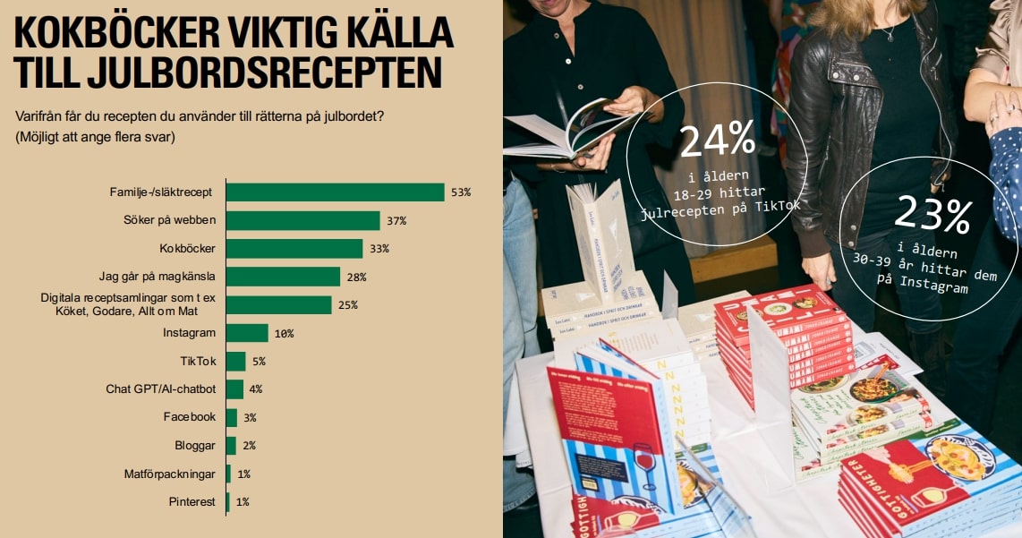 Näst vanligaste källan för julmatsrecept är webben med 37 procent medan tredjeplatsen intas av kokböcker med 33 procent (flera val möjliga, därav mer än 100 procent).