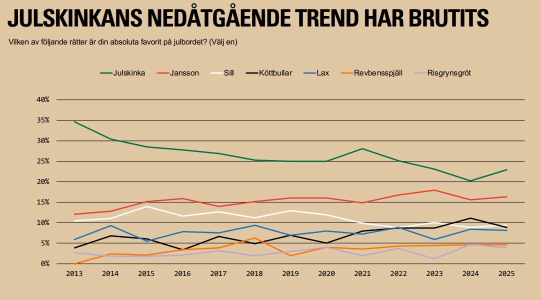 I år ökar julskinkan från 20 till 23 procent av rösterna och har därmed en betryggande ledning till tvåan Janssons frestelse med 16 procent. På tredje plats med nio procent hamnar den älskade sillen. Resultatet bekräftas av svaren på frågan vilken sorts mat man vill ska dominera på julbordet: överlägsen etta med 70 procent är kött och chark följt av fisk och skaldjur med 37 procent (två val möjliga, därav mer än 100 procent).