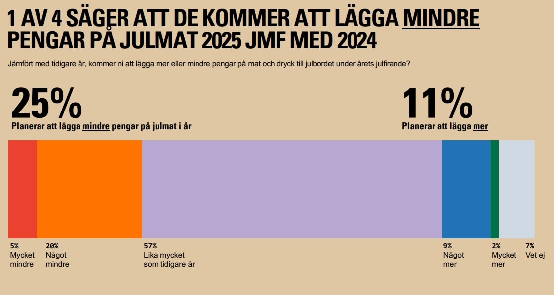 På frågan om man kommer lägga mer eller mindre pengar på julbordet i år jämfört med förra året svarar 25 procent att man kommer lägga mindre, medan 11 procent planerar att lägga mer.