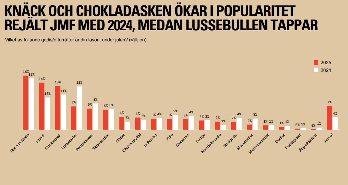 Fikatraditionen lever starkt: Ris à la Malta toppar för sjunde året i rad (15 procent), men lussebullen tar in på andraplatsen (13 procent), särskilt i storstäderna, medan landsbygden fortfarande föredrar Ris à la Malta. På tredje plats hittar vi den klassiska chokladasken. Julgodiset har en lång tradition som sträcker sig tillbaka till 1600-talet, och nästan var fjärde svensk lägger upp godis, frukt och nötter på ett särskilt konfektbord efter julbordet. För många startar julfirandet redan vid första advent med både skinka och julgodis på bordet.
